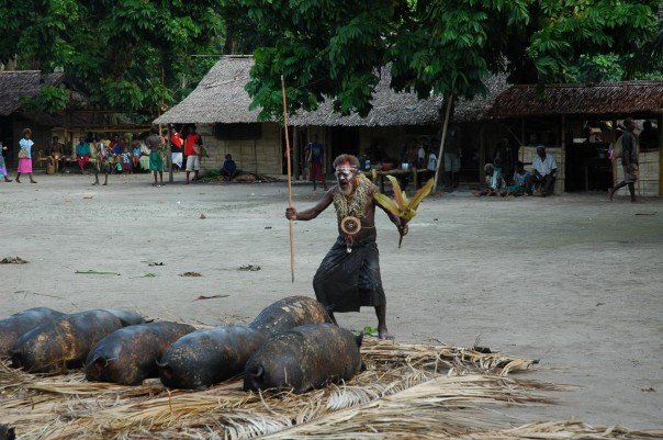One pig has been sacrificed for each Malagan displayed in the enclosure, on the Malagan house.